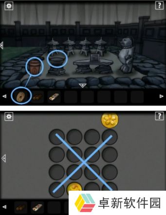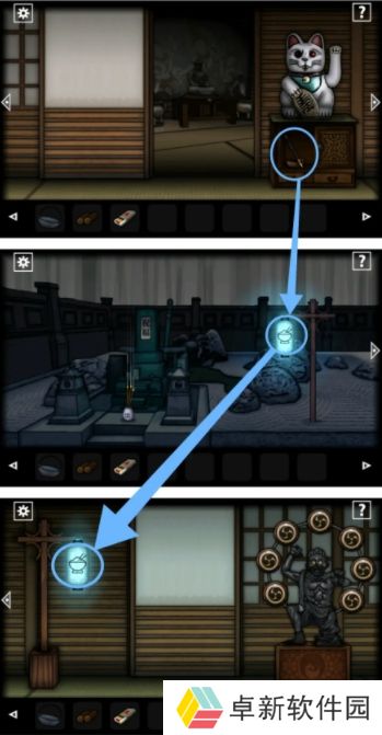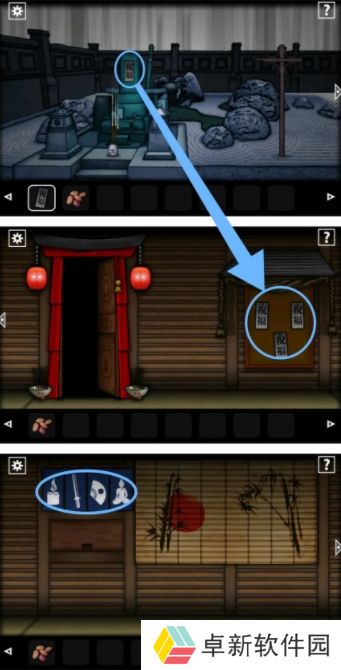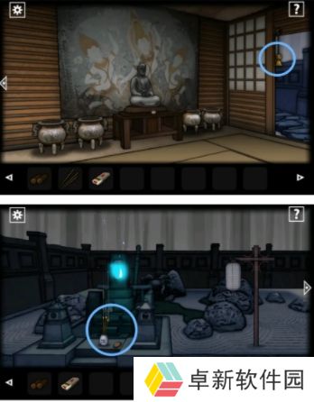 2.之后小伙伴们通过第二个房间前往到中庭,将我们的【灯笼】挂上右侧的柱子上获得道具【钥匙】,然后在前往第三个房间用【钥匙】将柜子打开拿到【火柴】以及吧柜子上的【香】给拿走,小伙伴们在这里注意卷轴里的提示,是对应后面的解谜;