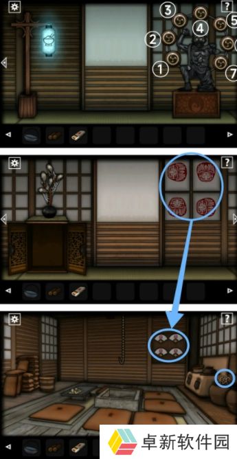 1.按【1】*2【2】*4【31】*4【1】*1这是个顺序打开大门,在金额到房间要先观察第三个房间挂的画,再根据图片上所示的涂鸦将第一个房间的柜子给打开拿到里面的【灯笼】;