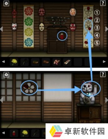 10.再根据屏风上画的提示正确调整能获得【血瓶】,之后再到第二个房间点击招财猫并且记住花瓣的的位置然后按【④②③⑤③②④】这个顺序去点击旗子获得【蓝色墨水】;