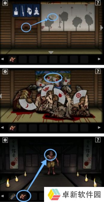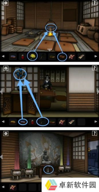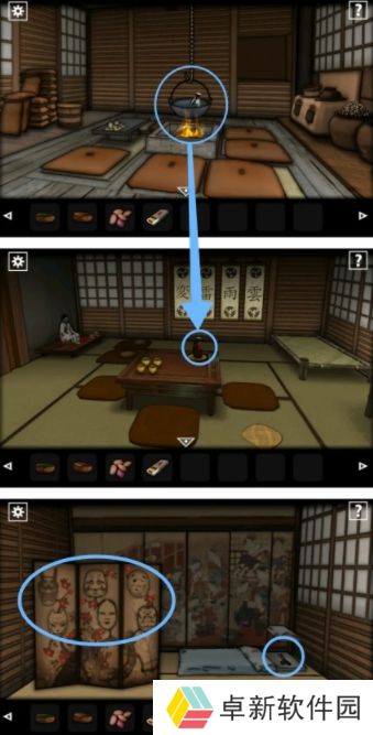 8.小伙伴们在这个场景需要放入木头点燃再挂上铁锅,然后在放入【清酒】改变温度并且将它放在第一个房间吸引女鬼,接着到第四个房间拿走放在枕头底下的【剪刀】,而且要注意屏风的画位置后面有用;