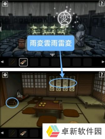3.小伙伴们使用【火柴】将点燃庭灯会出现的提示要认真观看,然后到第一个房间小伙伴们按【雨変云雨雷変】这个顺序点击旗子就能获得【晴天娃娃】,然后再拿走左侧的【木头】;