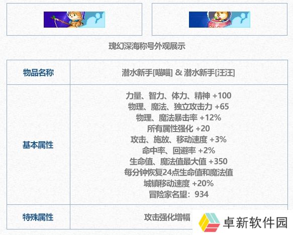 通过【深海探险资格证商店】获得【瑰幻深海隐藏称号变换券】,将礼包中的2种称号(喵喵/汪汪称号)变更为“超级潜水大师”称号,该称号无法交易,变化时将初始称号的附魔效果(属性与普通称号一直,仅外观不同)。