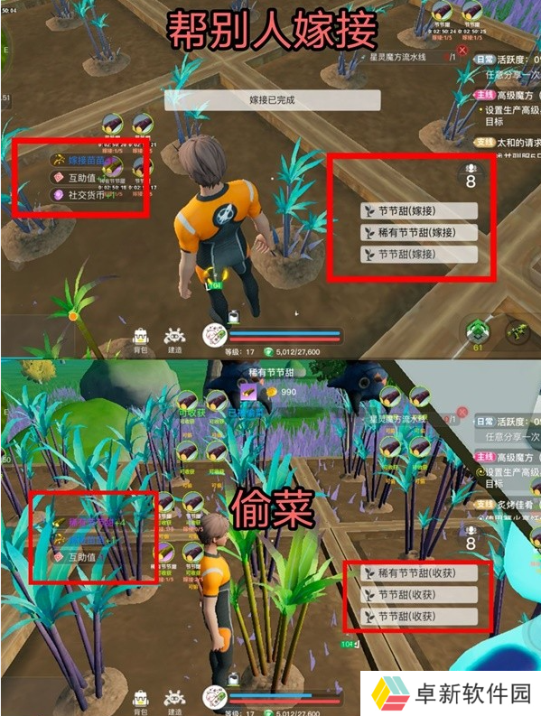 帮别人作物消耗1个嫁接苗,可以获得互助值,之后可以偷别人的菜消耗互助值获得1个嫁接苗和作物。